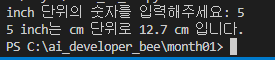 5를 입력했을 때 12.7 cm 가 나온다면 오류 없이 잘 출력 된 거예요.