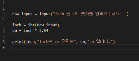 >>> raw_input = input ( " inch 단위의 숫자를 입력해주세요 : ")