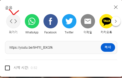 공유하기를 누르면 가장 왼쪽 아이콘으로 <> 퍼가기가 있습니다.