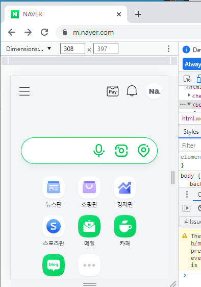 네이버의 pc화면에서 토글 디바이스 버튼을 누르면 다음과 같이 뜹니다.