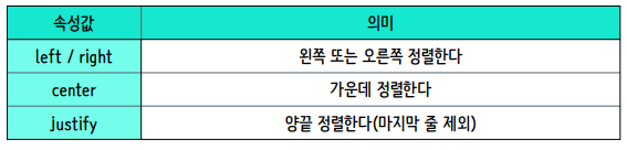 블록 내에서 텍스트의 정렬 방식을 정의합니다.