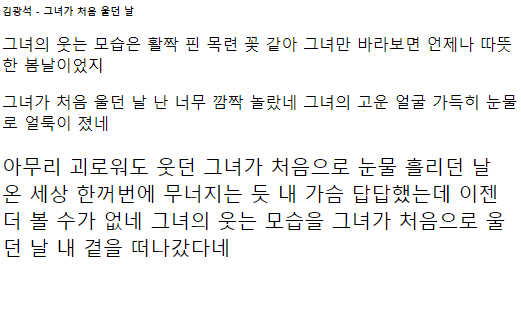 그녀가 처음으로 울던 날 내 곁을 떠나갔다네 </p>