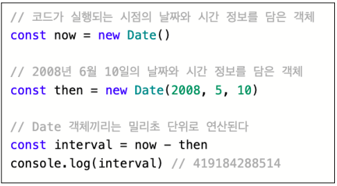 Date는 객체 생성 시에 new 연산을 해야하며, 생성자 함수에 인자를 전달하여 원하는 시간으로 객체를 초기화할 수 있습니다.