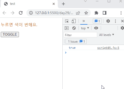이제 토글에 대한 예제로 스위치의 on, off처럼 글자를 누르면 색이 변하는 코드를 작성해보겠습니다.