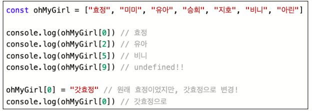 배열의 데이터를 부르는 표현 : 요소, 멤버, 아이템, 엘리먼트 이라고 합니다.
