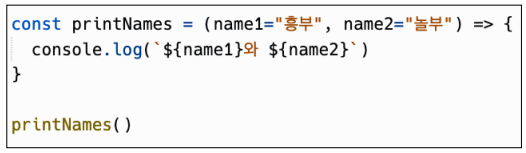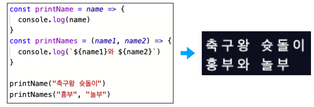 const introduce2 = (n) => console.log($`{n} 입니다.`) // 명령문이 하나만 있으면 중괄호 생략이 가능하다.