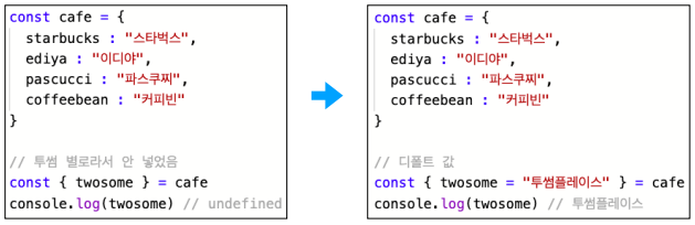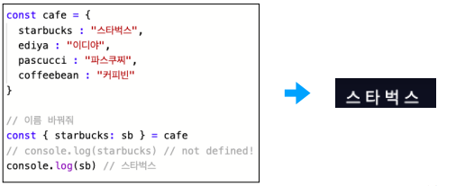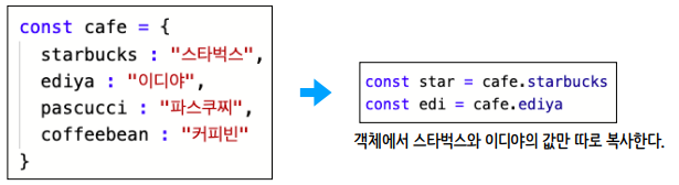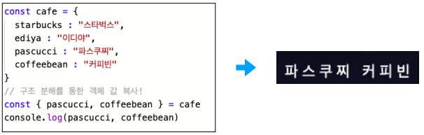 동명의 상수를 만들 때 중괄호로 만들어주면, 파스쿠찌와 커피빈이라고 하는 키의 값을 객체로부터 구조 분해하겠다는 뜻이 되며 그 객체 = 는 cafe 라는 의미가 됩니다.