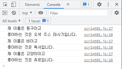 console.log(`좋아하는 것은 ${a}입니다.`)