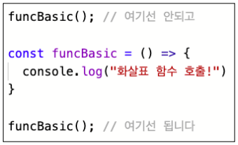 1. 화살표 함수는 호이스팅(함수를 선언하는 것보다 호출을 먼저 하는 것) 이 불가능합니다.
