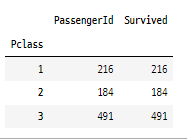 titanic_groupby = titanic_df.groupby('Pclass')[['PassengerId', 'Survived']].count()