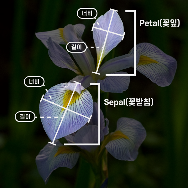 - 피처로는 꽃잎의 길이와 너비, 꽃받침의 길이와 너비가 주어진다.