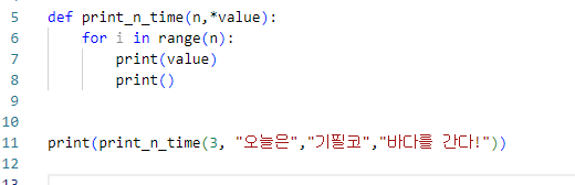 def print_n_time(*value,n=3): -> 가변 매개변수와 기본 매개변수를 동시에 씁니다.