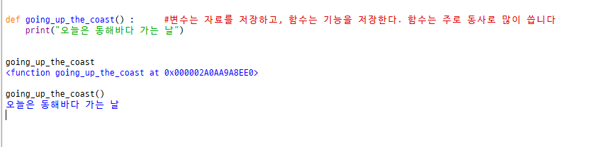 def going_up_the_coast() : #함수는 주로 동사로 많이 씁니다