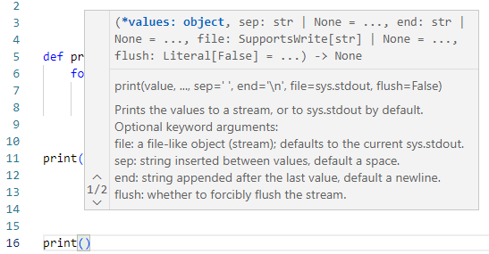 VS(비주얼스튜디오) 코드를 열어서 print() 를 입력했을 때 여러가지 값이 뜨는데