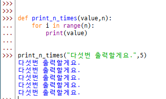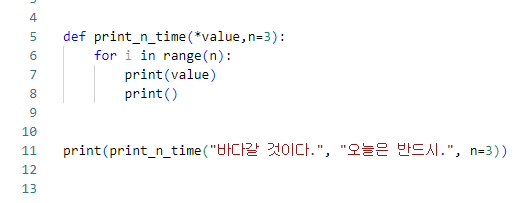 print(print_n_time("바다갈 것이다.", "오늘은 반드시.", n=3)) -> 그리고 기본 매개변수의 값을 n=3 으로 입력했을 때