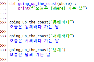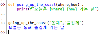 오늘 저는 수업 끝나고 동해바다를 갈 거예요. 그럼 동해바다를 간다고 출력하는 함수를 만들어볼게요.