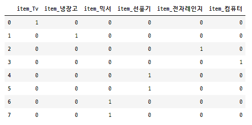 고유값에 해당하는 칼럼에만 1을 표시하고 나머지 칼럼에는 0을 표시합니다.