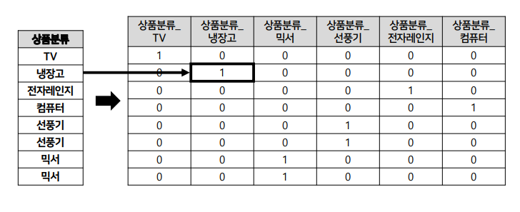 즉, 피처의 유형에 따라 새로운 피처를 추가하고 고유값에 해당하는 칼럼에만 1을 표시하는 거예요.
