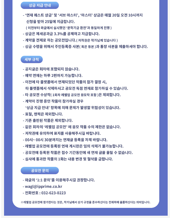 - '연재 퀘스트 상금' 및 '서브 마스터', '마스터' 상금은 매월 20일 오후 3시까지 신청을 받아 25일에 지급합니다. (이전부터 와글에서 실시했던 '문학기금 환전'과 동일하게 진행합니다.)