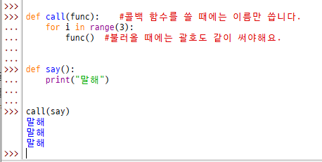 say 함수 속에 안녕하세요를 출력하는 함수를 넣어주었습니다.