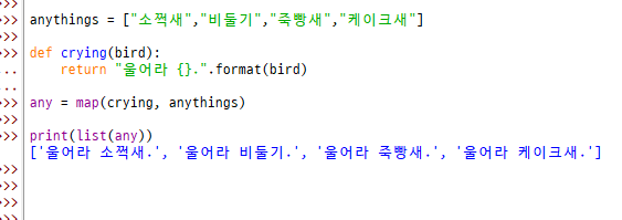 map(함수, 리스트) -> 리스트에 있는 요소들을 함수에 대입해서 새로운 리스트를 만들어요.