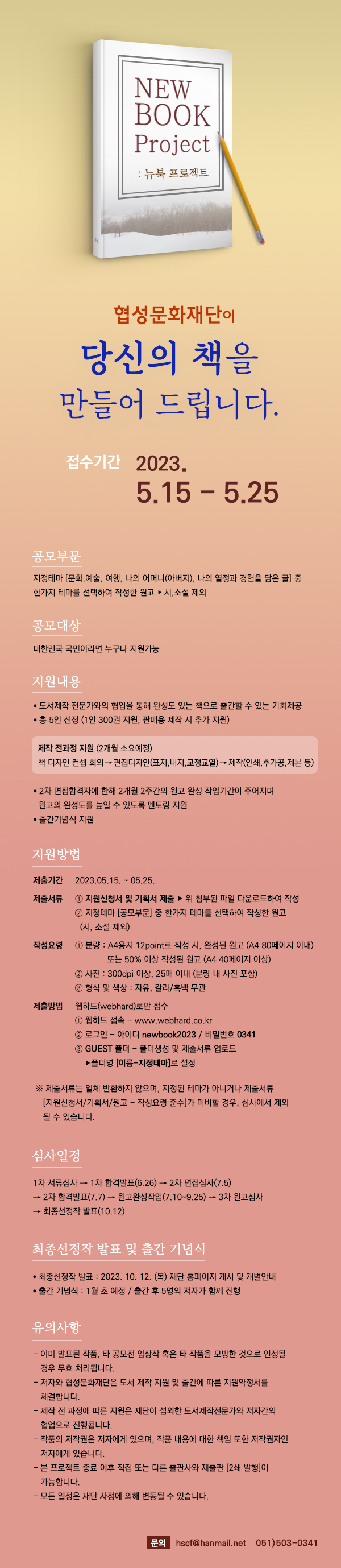 - 지원 신청서 및 기획서(홈페이지 다운로드), 원고(분량 및 형식 홈페이지 확인)를