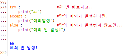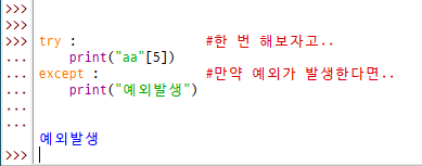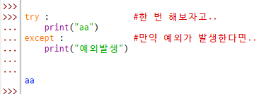 except : 만약 예외가 발생하면 어떻게 할지 작성