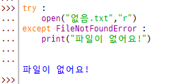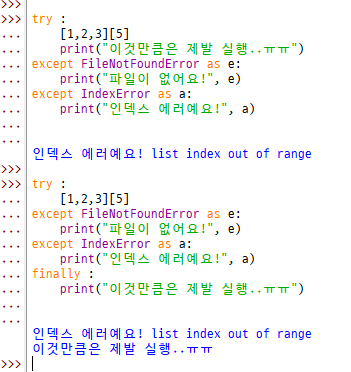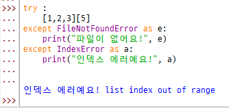 ● except 는 각 예외 상황 별로 출력을 정할 수 있음