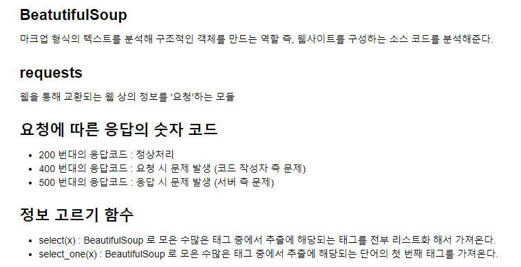BeautifulSoup 모듈을 사용할 때, 우선 requests 로 자료를 요청해서 가져오는 것이 순서입니다.