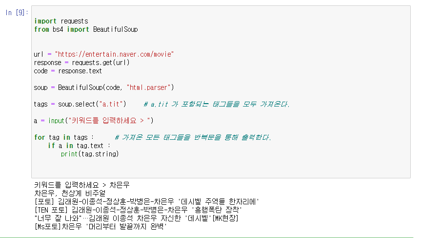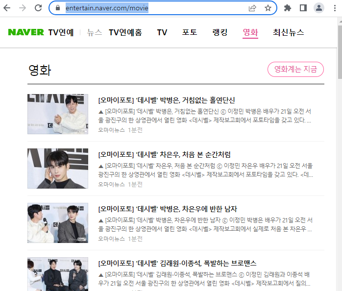 그럼 이것을 응용해서 네이버 영화 관련 기사에서 특정 검색어를 입력해서 뉴스 기사 제목을 얻어오는 것을 해볼게요.