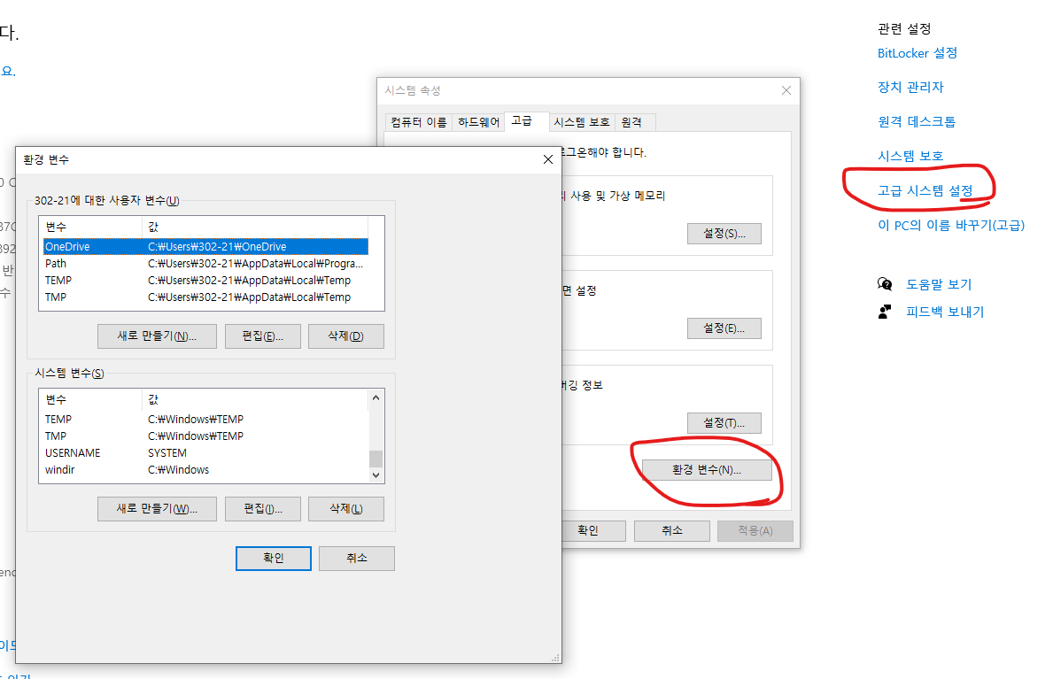 속성 페이지 -> 고급 시스템 설정 -> 고급탭 -> 하단의 활성변수