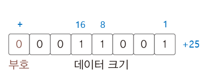 위 그림에서 8칸의 비트로 1바이트를 표현하게 되면 양수입니다.