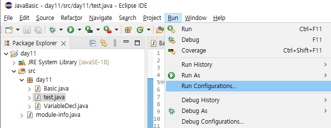 자바에서 한글이 깨져서 나오는 경우 옵션에서 Run -> Configurations 로 들어가서 설정해주어야해요.